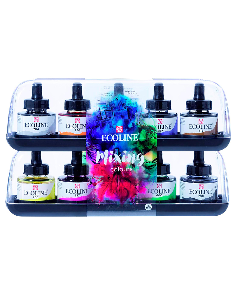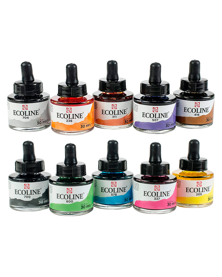 Este estuche contiene 10 botes de acuarela líquida Ecoline en varios colores brillantes. Los botes redondos Ecoline son estables y tienen una abertura amplia, lo que te permite trabajar directamente desde ellos, usando un pincel o Brush Pen. Además, los botes cuentan con una práctica pipeta con la que podrás verter fácilmente la cantidad necesaria de Ecoline en bandejas de mezcla o directamente sobre tu obra. Los colores transparentes ofrecen los mejores resultados cuando se utilizan sobre papel blanco o de colores muy claros.