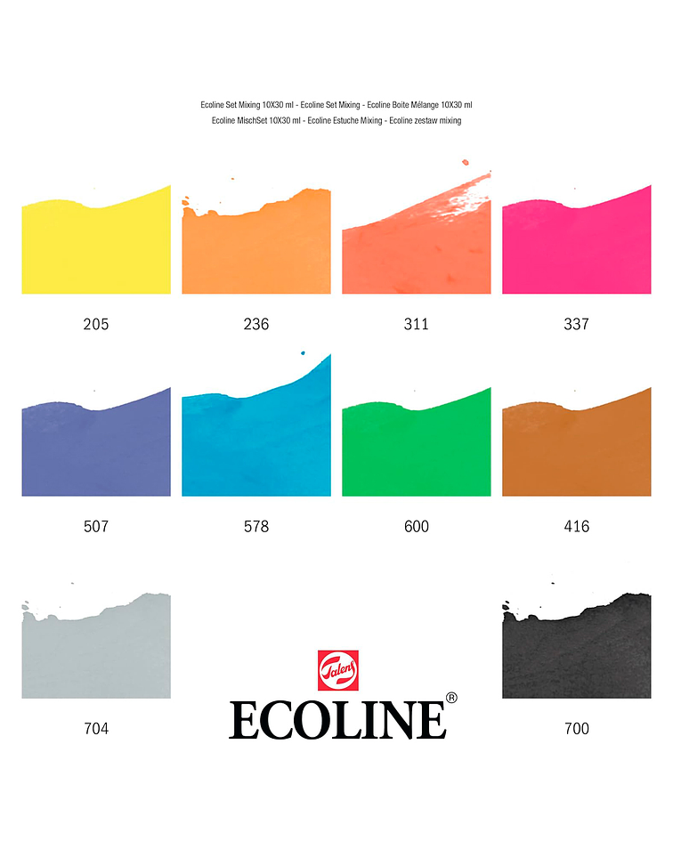 Contenido: 10 botes de 30 ml (205 Amarillo limón (primario) – 236 Anaranjado claro – 311 Bermellón – 337 Magenta – 507 Azul ultramar violeta – 578 Azul celeste (cian) – 600 Verde – 416 Sepia – 704 Gris – 700 Negro).