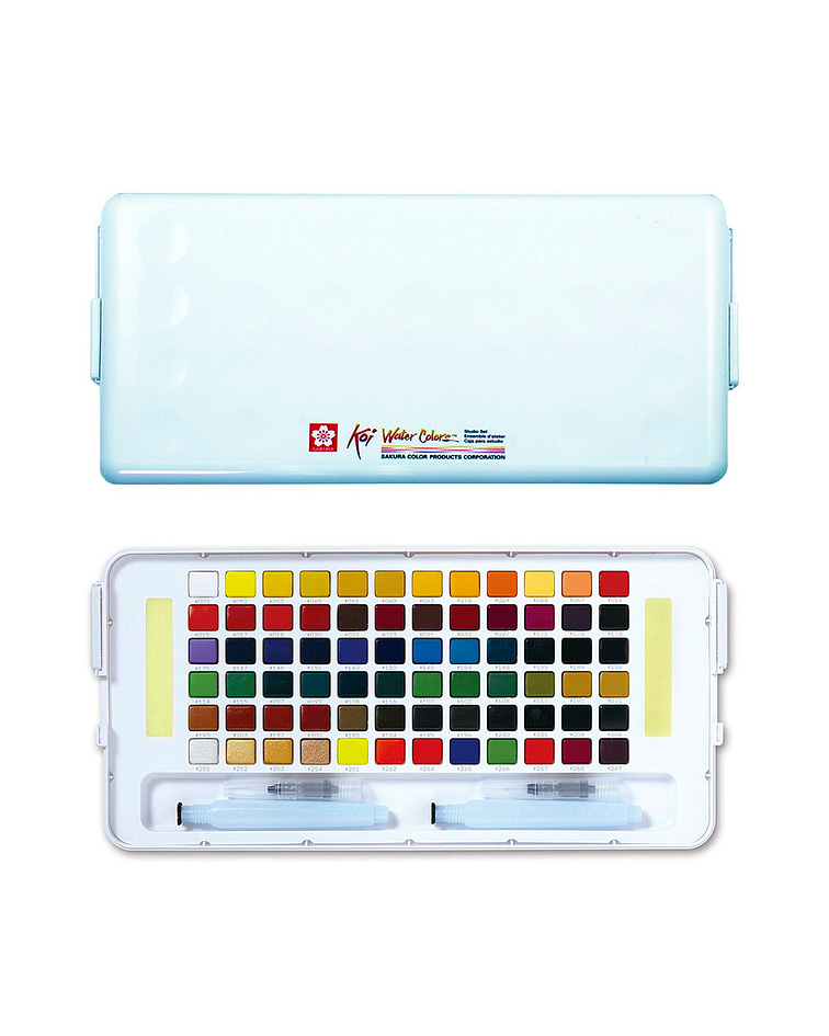 Las acuarelas Koi son pinturas divertidas e intensas para ilustrar, decorar y crear obras de arte. Este estuche de estudio contiene 72 tonos e incluye una paleta de mezcla desmontable, dos esponjas y dos Koi Water Brushes (pinceles con depósitos de agua).