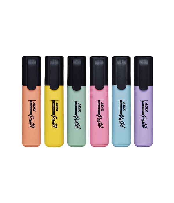 Set de destacadores tinta borrable, 6 unidades, colores rosado, amarillo, verde, azul. violeta y naranjo, punta de poliester biselada de 4 mm, clip y cuerpo plástico. Goma de silicona incorporada. Para usar en papel de fax o fotocopia. Ancho del trazo 3.