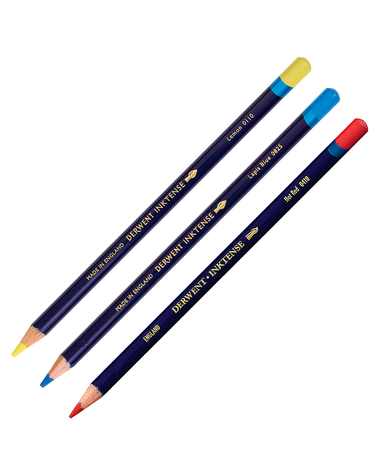 Los lápices Derwent Inktense tienen una textura muy fácil de difuminar y vienen en una gama de 99 colores brillantes, además de un delineador no soluble que permite dibujar contornos permanentes, incluso con agua.