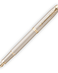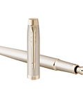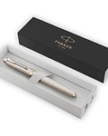 - Bolígrafo Parker con diseño en metal champagne, desde los adornos hasta el plumín.