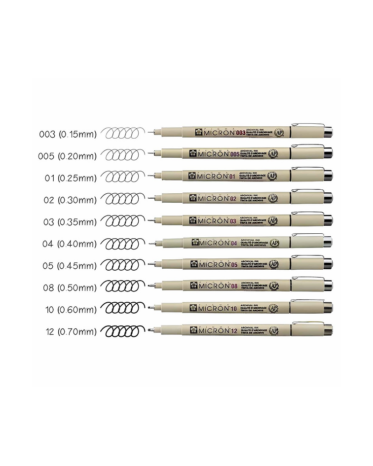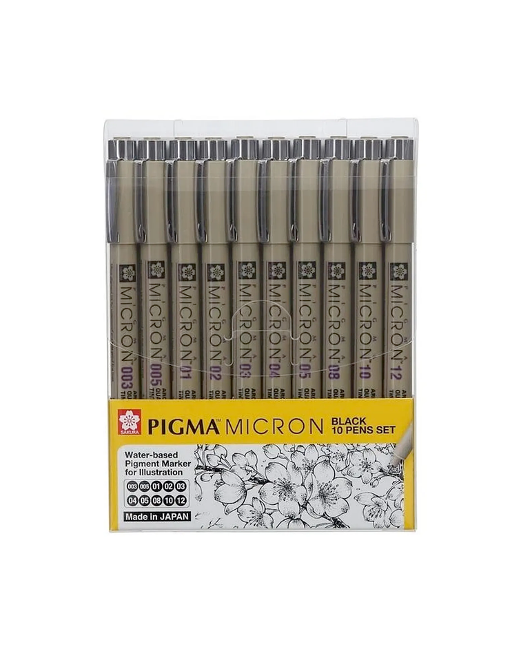 set cuenta con 10 grosores diferentes de Pigma Micron, para valorizar