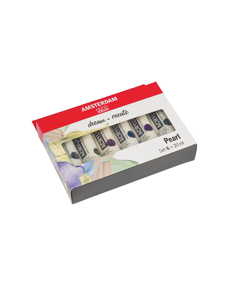 Prueba los seis colores especiales perlados de la gama de Amsterdam con este set de iniciación. Úsalos solos o mézclalos con colores transparentes para crear nuevos tonos metálicos. Aplícalos en finas capas sobre superficies oscuras para llevar al máximo el efecto perlado o crear un color sutil que brille en superficies claras.