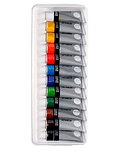 Se pueden aplicar directamente del tubo o con un pincel. Son perfectas para cualquier artista o estudiante. Los colores de esta selección son: blanco, amarillo medio, amarillo ocre, rojo brillante, escarlata, violeta, azul ultramar, verde medio, verde oscuro, marrón claro, marrón y negro.