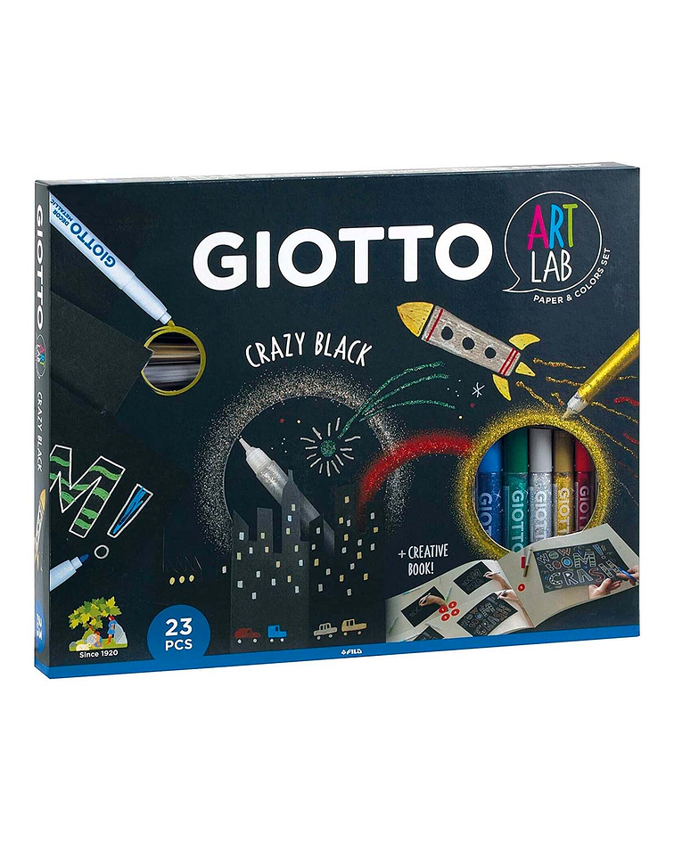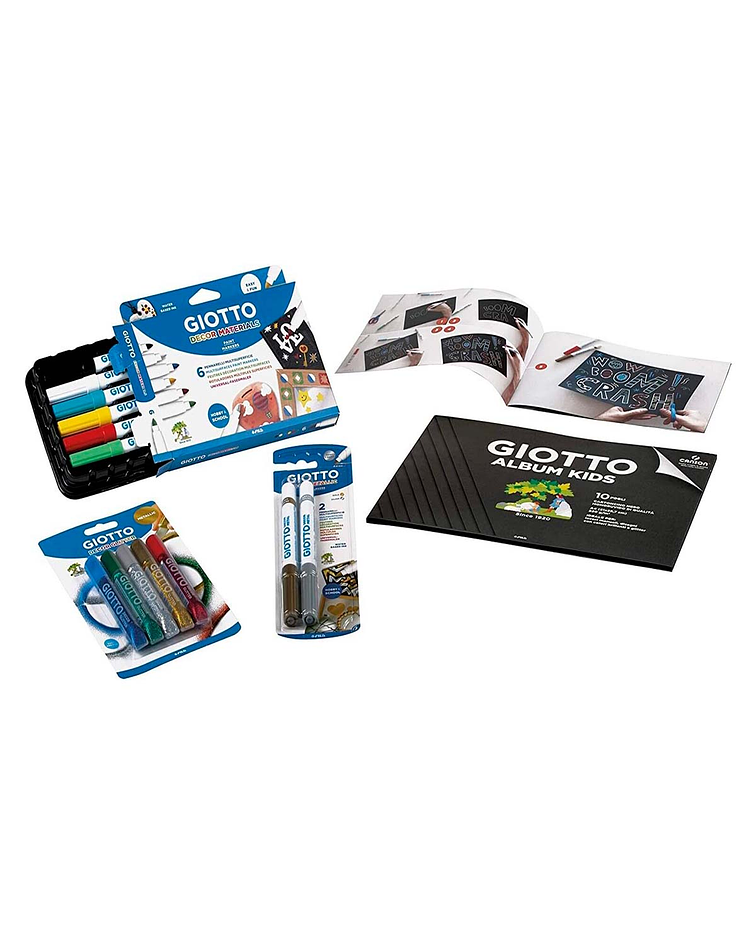 Con este set creativo de la línea GIOTTO ART LAB Paper&Colors, los niños pueden jugar con letras y onomatopeyas, la ciudad y el espacio. El set contiene: Giotto Álbum Kids con cartulina negra, Giotto Decor Metallic oro y plata, rotuladores Decor Materials, colas Decor Glitter y un libro creativo para inspirarse. ¡Porqué el negro es un color de otro mundo!