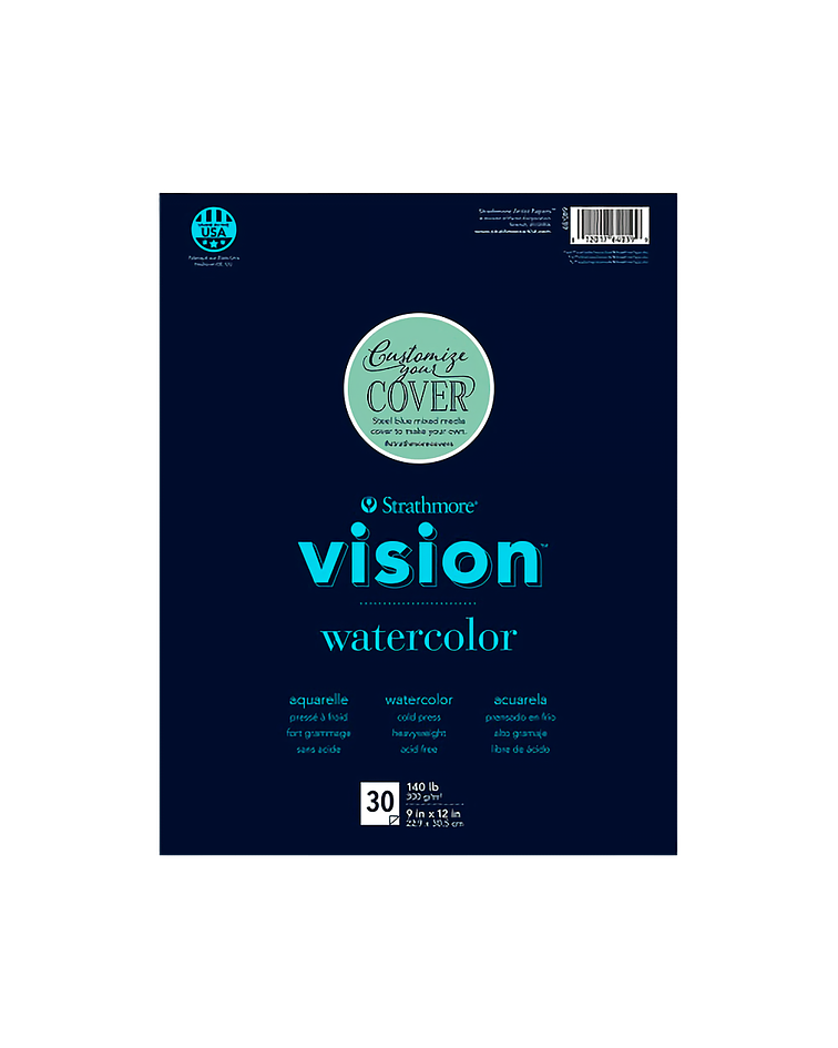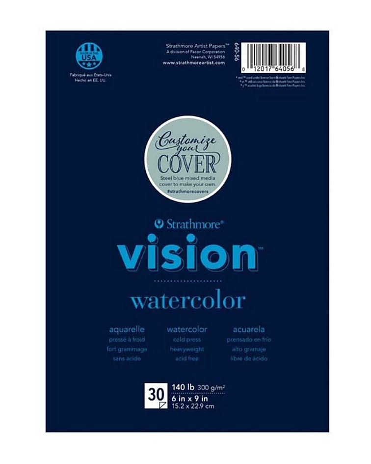 Strathmore Vision Acuarela es un papel económico con una superficie de prensado en frío. Este papel libre de ácido proporciona lavados uniformes y buenos levantamientos con técnicas de medios húmedos. Sus 4 tamaños cuentan con un alto número de papeles desplegables (30) y un soporte resistente de cartón. La portada superior de la croquera se puede arrancar para crear y personalizar en la página siguiente tu propia portada.